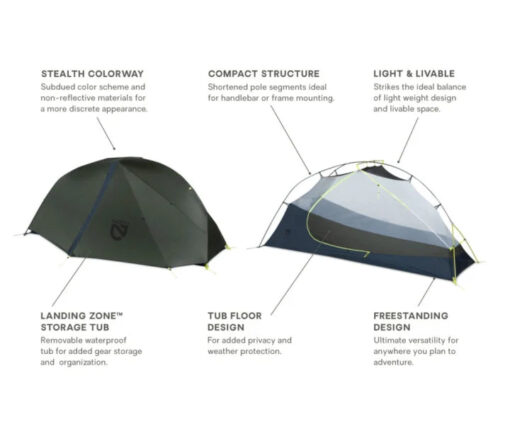 The Dragonfly Bikepack tent has a unique suite of features that make it the essential backpacking shelter. It starts with the carry bag, an extremely durable diamond ripstop roll-top stuff sack featuring reinforcements and tie-down straps perfect for fastening to your bike. The poles are made of shortened segments that keep the packed size small, and the stuff sack securely attaches to your handlebars, under the seat, to any rack, or inside the frame, giving you lots of options and flexibility.